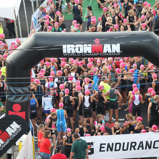 Immediately after the cannon went off for the AG men, women age groupers jumped in the water to swim to the ROKA buoy start line. I decided to wait a few minutes so that I didn't have to tread water as long and conserve as much energy as possible. I waited 5 minutes then hopped in the water and slowly swam to the start. I went to the left of the pack and straight to the front. I was really excited for this all women swim start. The anticipation for this race built! Three helicopters were thundering above us, crowds were cheering, and the Hawaiian drums produced the most dramatic start to a race that I have ever experienced. I positioned myself three athletes from the left, treading water waiting for the cannon to go off. It seemed like an eternity. As I waited the volunteer paddlers that were there to keep us in line and behind the start line were pushing me back, simultaneously I was being pushed by the girls behind me. Everyone was eager and ready to go. The cannon fired.